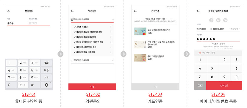 - 가입할 수 있는 사용자는, 본인 명의의 휴대폰을 통한 본인인증이 필수적이며, 현재 보유하고 있는 본인명의의 BC 신용/체크카드를 등록할 수