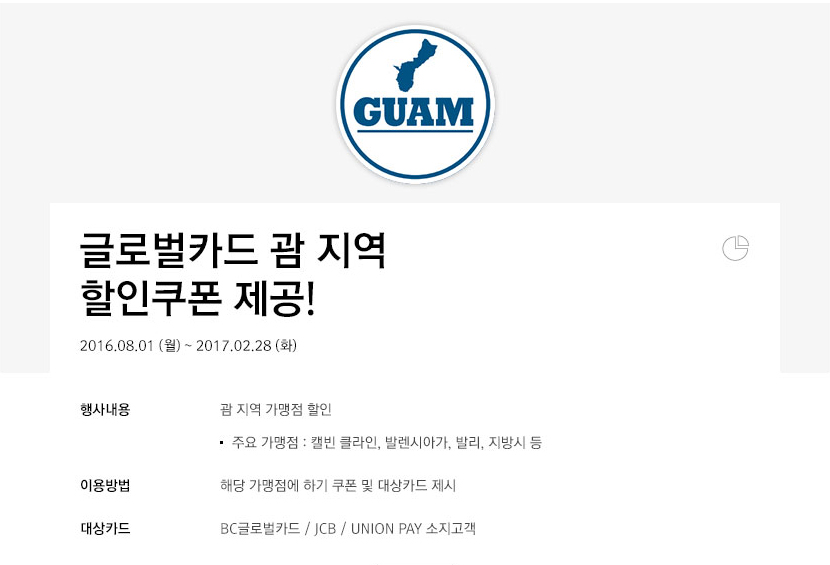 글로벌카드 괌 지역 할인쿠폰 제공!이벤트 기간 : 2016.08.01(월) ~ 2017.02.28(화)