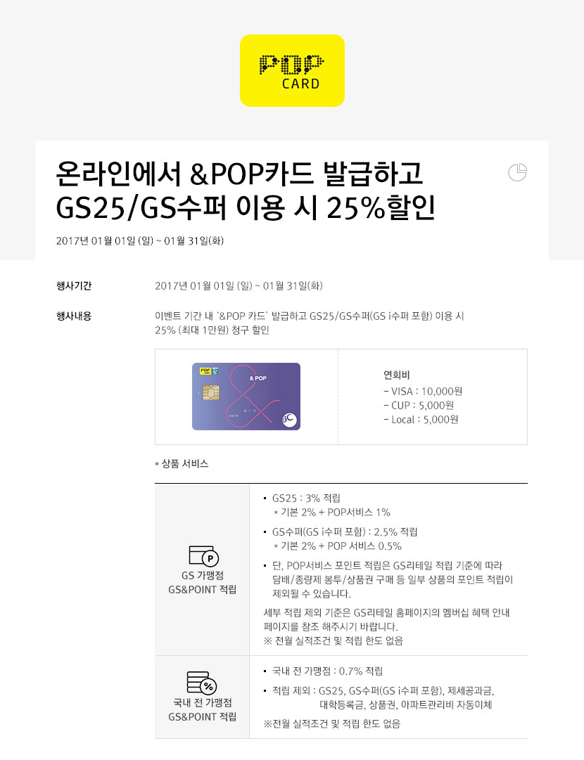 이벤트 기간내 '&POP카드' 발급하고 GS25/GS수퍼(GS i수퍼 포함) 이용시 25%(최대 1만원) 청구 할인