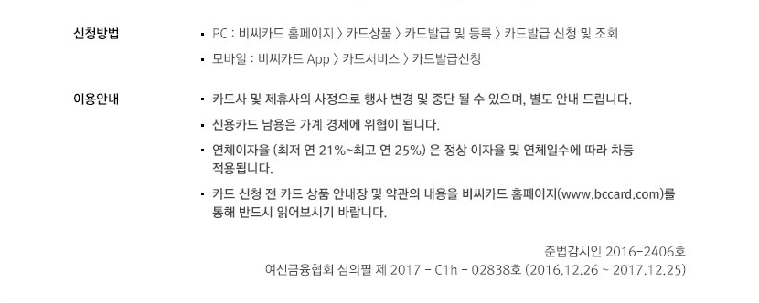 • 카드 신청 전 카드 상품 안내장 및 약관의 내용을 비씨카드 홈페이지(www.bccard.com)를 통해 반드시 읽어보시기 바랍니다.
