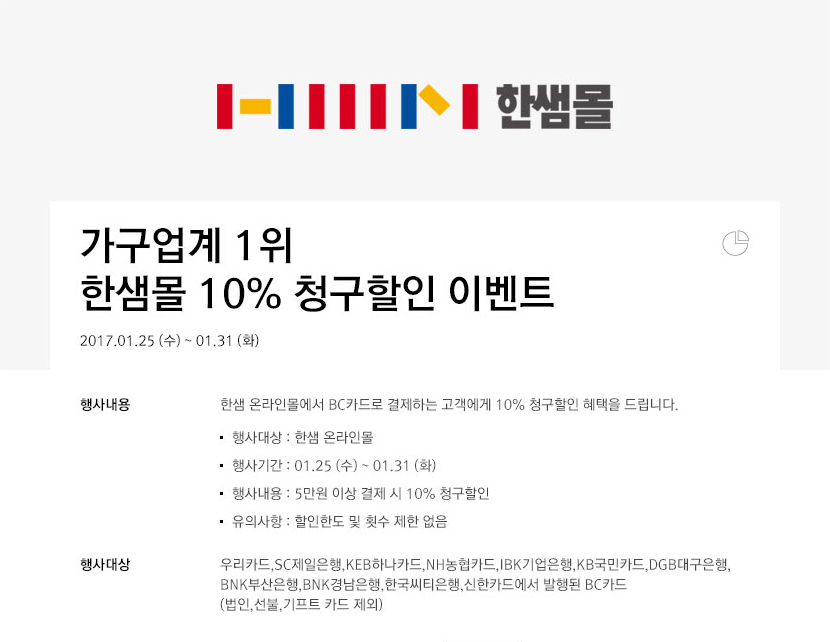 가구업계 1위 한샘몰 10% 청구할인 이벤트2017.01.25(수) ~ 01.31(화)