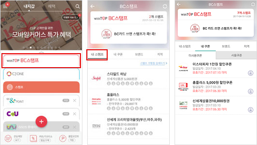누적된 모바일 스탬프는 CLiP 내 BC스탬프 멤버십 및 withTOP를 통해서 쿠폰 발급 후