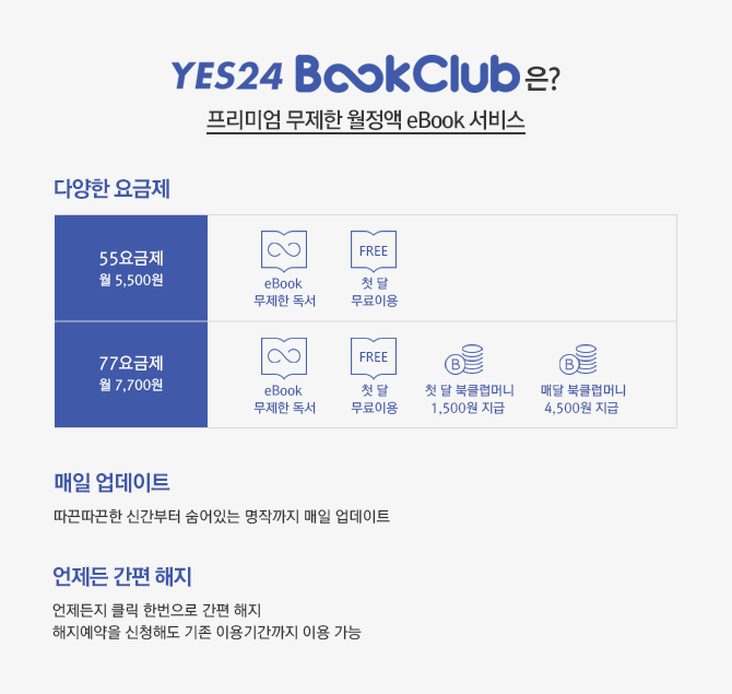- 77요금제 ( 월 7,700원) : eBook 무제한 독서 / 첫 달 무료이용 / 첫 달 북클럽머니 1,500원 지급 / 매달 북클럽머니 4,500원 지급