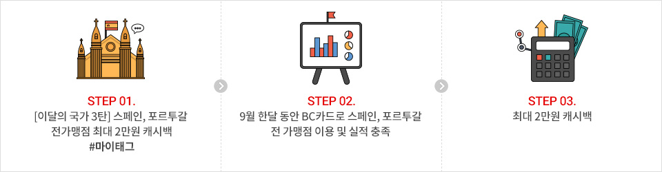 - STEP 02. 9월 한달 동안 BC카드로 스페인, 포르투갈 전 가맹점 이용 및 실적 충족