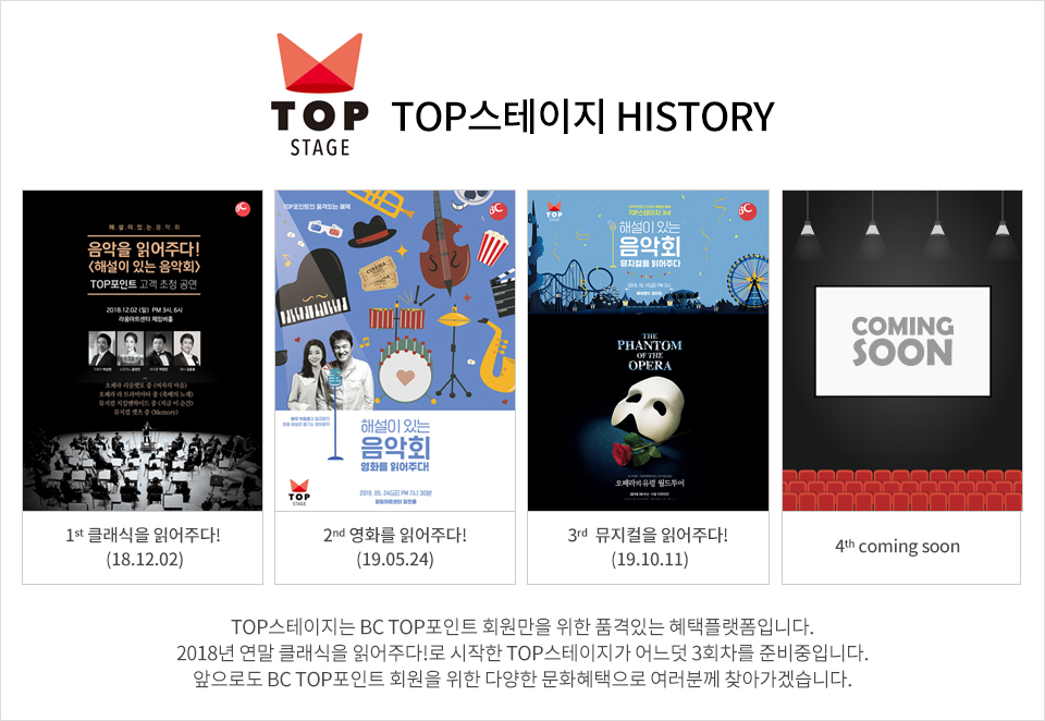 앞으로도 BC TOP포인트 회원을 위한 다양한 문화혜택으로 여러분께 찾아가겠습니다.
