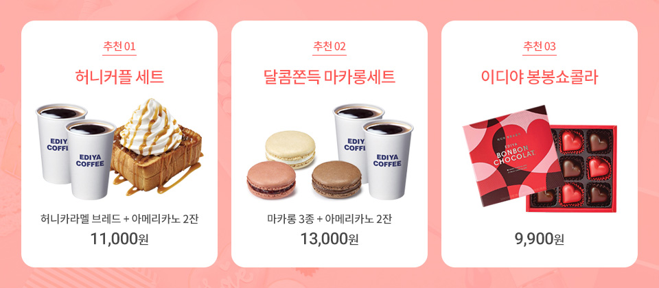 - 추천 02 달콤쫀득 마카롱세트 - 마카롱 3종 + 아메리카노 2잔 → 13,000원