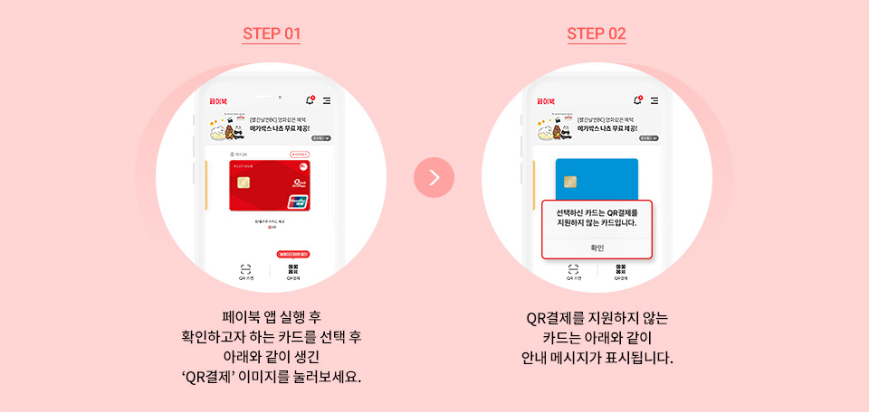 - STEP 02 QR결제를 지원하지 않는 카드는 아래와 같이 안내 메시지가 표시됩니다.