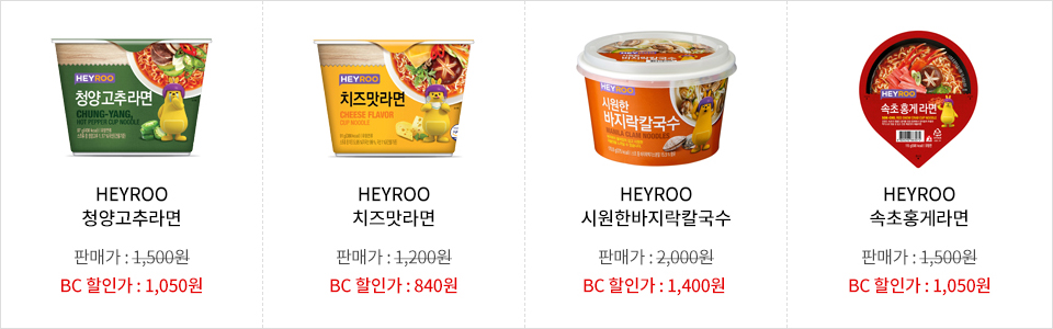 - BC카드로 HEYROO 컵라면 4종 구매 시, 30% 현장할인 (1회 최대 2,000원 할인)