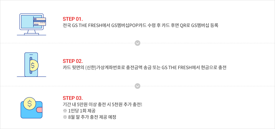 - STEP 03. 기간 내 5만원 이상 충전 시 5천원 추가 충전! ※ 1인당 1회 제공 ※ 8월 말 추가 충전 제공 예정