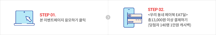 - STEP 02. <우리 동네 페이북 EAT딜> 총13,000원 이상 결제하기 (당첨자 140명 1만원 캐시백)