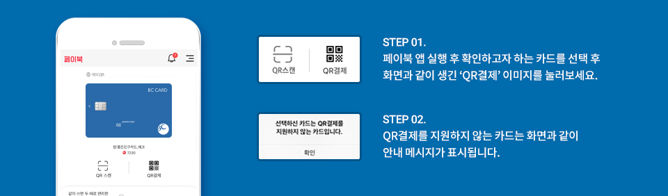- STEP 02. QR결제를 지원하지 않는 카드는 화면과 같이 안내 메시지가 표시됩니다.