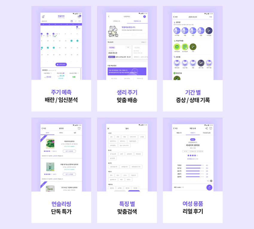 - 생리주기를 기록하고 예측된 예정일에 맞춰, 나만의 여성 제품을 정기배송으로 구매 및 관리할 수 있는 서비스