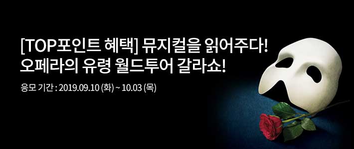 상기 수집된 정보는 [TOP스테이지] <오페라의 유령> 뮤지컬을 읽어주다 응모 이벤트 운영목적에만 활용되며 추가적인 마케팅 목적에 활용되지 않습니다.
