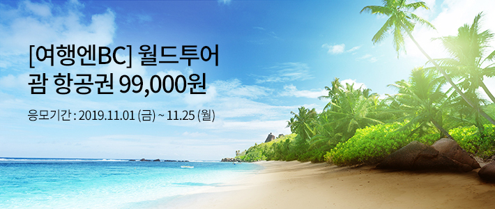 상기 수집된 [여행엔BC] 월드투어 괌 항공권 99,000원 이벤트 운영목적에만 활용되며 추가적인 마케팅 목적에 활용되지 않습니다.