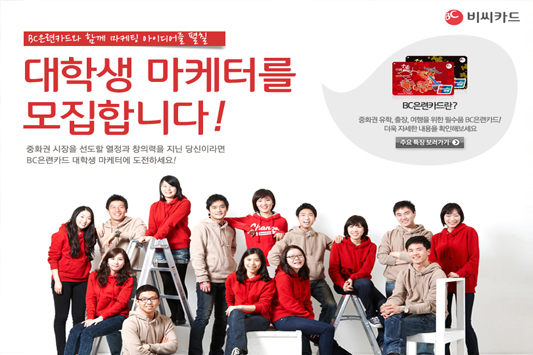 BC카드(대표이사 사장 이강태, www.bccard.com)는 BC은련카드의 홍보 및 아이디어 제안 활동 등을 위한 BC은련카드 대학생 마케터를 모집한다고 11일 밝혔다. BC은련카드는 중화권 특화카드로써 중국 유학, 여행, 출장을 위한 ATM 수수료 캐시백 서비스, 홍콩/마카오 지역 캐시백, 호텔 1박 무료 서비스 등의 다양한 혜택을 제공하고 있다. BC은련카드 대학생 마케터는 이러한 BC은련카드 상품의 혜택 및 브랜드에 대한 마케팅 아이디어 제안 및 트렌드 조사, SNS 홍보, 상품 모니터링의 체험을 통해 실무 마케터로서의 역할을 경험할 수 있는 기회가 부여된다. 또한 소셜 미디어 등 온라인을 통한 마케팅 활동과 조별 미션을 통한 과제 수행 등 다양한 활동을 하게 된다. 대학생 마케터들에게는 월별 활동비 지급 및 커뮤니케이션 명함을 제공하고 우수활동팀 에게는 겨울방학 중 중국 북경, 상해, 그리고 홍콩/마카오 지역의 해외 탐방을 지원한다. 또한 3개월간의 마케터 활동을 마친 전원에게 수료증도 지급된다. BC은련카드 대학생 마케터는 홍보 및 마케팅 분야에 관심을 가진 열정적인 대학생이라면 누구나 지원가능하며 특히 중국어 전공자, 중화권 어학연수 및 교환학생, 그리고 SNS 활동이 활발한 대학생은 선발 시 우대할 예정이다. 지원방법은 BC카드 페이스북(http://www.facebook.com/thebccard)에 접속하여 온라인 지원서를 작성하여 제출하면 된다. 온라인 지원서 접수는 9월 21일(금)까지 진행되며 9월 25일(화) 면접을 거쳐 총 25명을 선발한다. 최종합격자 발표는 9월 26일(수)이며 9월 27일부터 12월 27일까지 총 3개월간 BC은련카드의 대학생 마케터로써 활동을 하게 된다. BC카드 글로벌사업팀 관계자는 “대학생 마케터들이 BC은련카드와 관련한 다양한 마케팅 실무를 체험할 수 있도록 적극 지원할 예정” 이라면서 “열정을 가진 대학생들의 많은 참여를 기대하고 있다” 고 밝혔다. BC은련카드 대학생 마케터 모집과 관련한 문의는 이메일(bccard@medicompr.co.kr) 및 전화(02-6370-8039)로 가능하다. |