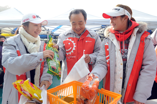BC카드(대표이사 사장 이강태, www.bccard.com)는 "사랑의 버디 식품나눔행사"를 진행한다고 28일 밝혔다. "사랑의 버디 식품나눔행사"는 올해 4월부터 BC카드가 후원하는 프로골퍼들이 KLPGA 투어기간 동안 버디를 성공할 때마다 일정금액을 기부하고, 선수들이 적립한 금액만큼 BC카드도 매칭그랜트 방식으로 적립한 '사랑의 버디 공동기금'으로 준비된 행사이다. 2009년부터 지속적으로 프로골프 선수들을 후원해온 BC카드는 현재 2012년 KLPGA상금왕을 차지한 김하늘 프로를 비롯하여 김혜윤, 이성운, 임미소 프로를 후원하고 있다. BC카드는 지난 2009년 서울시 사회복지협의회에 상품 진열을 위해 별도로 개조한 국내 최초의 '이동 푸드마켓'을 기증하고, 매년 차량내부에 생필품을 진열한 후 저소득층 이용객들의 거주지로 직접 순회방문을 하여 생필품을 전달하는 사회공헌활동을 전개해 왔으며, 이날 진행된 "사랑의 버디 식품 나눔행사"의 생필품은 '사랑의 버디 공동기금'으로 구입되어 보다 뜻깊은 행사가 되었다. 이날 중랑구 소재 용마폭포공원에서 오후 2시부터 진행된 "사랑의 버디 식품나눔행사"에는 BC카드 이강태 사장, 서울시 사회복지협의회 황용규 회장, BC카드가 후원하는 프로골퍼 김하늘, 김혜윤, 이성운, 임미소 및 BC카드 "사랑,해 봉사단" 단원 35명이 참석한 가운데 진행되었다. "사랑의 버디 식품나눔행사"에는 쌀, 라면, 통조림, 식용유 등의 생필품을 1인 5품목까지 수령이 가능하며, 거동이 불편한 독거노인 가정에는 BC카드 이강태 사장과 BC카드 소속 프로골퍼 김하늘 및 "사랑,해 봉사단" 단원들은 직접 방문하여 생필품을 전달하기도 했다. BC카드 이강태 사장은 "BC카드가 후원하는 프로선수들이 어려운 이웃들에게 사랑과 희망을 나누는데 선뜻 동참해주어, 후원사로서 더욱 뿌듯한 한해였다"라면서 "앞으로도 BC카드는 우리 사회에 나눔 문화를 확산하는데 앞장설 것" 이라고 밝혔다. 또한 이날 행사에 참가한 BC카드 김하늘 프로골퍼는 "올 시즌은 좋은 성적을 낼수록 좋은 일을 하게 된다는 생각에 더욱 열심히 경기에 임했던 것 같다"면서, "좋은 기회를 마련해주신 BC카드에 감사드리며, 앞으로도 지속적인 이웃사랑을 실천하겠다"고 다짐했다. 한편, BC카드는 2005년부터 "이동식 푸드마켓 식품나눔행사, 빨간밥차 무료급식 지원" 등을 임직원 봉사활동과 병행하여 지속적으로 추진해오고 있다. |