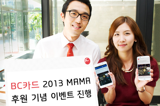 국내외 유명 아티스트들이 참석하는 2013 MAMA 공연보러 홍콩가자 BC카드, 2013 MAMA 후원 기념 이벤트 진행 - UnionPay International과 함께 CJ E&M에서 주최하는 2013 MAMA 공동 후원 (Title Sponsor) - 총 40명의 고객에게 홍콩에서 진행되는 2013 MAMA 행사에 참여기회 제공 - 2013 MAMA 공식 로고가 삽입된 선불카드 상품 출시 등 다양한 이벤트 진행