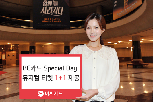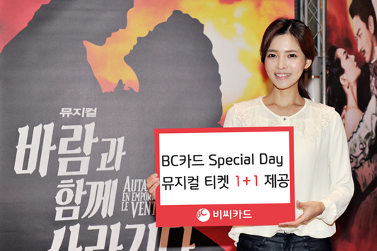 BC카드(대표이사 사장 서준희, www.bccard.com)가 뮤지컬 티켓 1매 구매 시, 동일 등급의 티켓 1매를 추가로 제공하는 ‘BC카드 Special Day’는 BC카드 고객이면 누구나 이용할 수 있는 문화공연 할인 서비스로, ‘BC카드 Special Day’에 진행되는 공연예매 시 티켓 1+1 제공, 1만원 티켓 제공 등과 같은 혜택을 제공 중이다. 이번에 진행되는 ‘BC카드 Special Day’는 1월 25일 예술의 전당에서 공연되는 뮤지컬 <바람과 함께 사라지다>의 공연티켓 1매 구매 시, 동일한 등급의 티켓 1매를 추가로 제공하는 이벤트이다. 티켓은 1월 11일 오전 11시부터 BC카드 라운.G 사이트(loung.bccard.com)를 비롯한 옥션, 인터파크, 예스24 등에서 티켓을 구매할 수 있다. (예매문의 : ☎ 1577-4388, 라운.G 고객센터) 한편, BC카드는 지난 2014년 한해동안 뮤지컬 <위키드>, <맘마미아>, <지킬 앤 하이드> 등 다양한 뮤지컬 공연과 함께 12회에 걸쳐 ‘BC카드 Special Day’를 진행한 바 있으며 이 기간 동안 총 3만명의 고객들이 혜택을 제공 받았다.