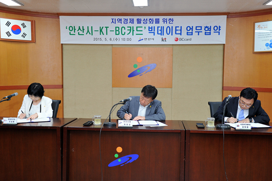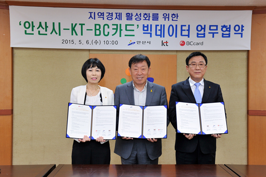 [보도자료 사진설명] BC카드는 6일 오전 10시, 경기도 안산시 단원구 소재 안산시청에서 BC카드 전경혜 영업부문장 (왼쪽), 제종길 안산시장(가운데), 장희엽 KT수도권 서부 고객 본부장(오른쪽) 등이 참석한 가운데 세월호 사고 이후 침체된 안산시 경제 활성화를 위한 빅데이터 협력 MOU를 체결했다. BC카드(대표이사 사장 서준희, www.bccard.com)가 kt(회장 황창규, www.kt.com)와 함께 안산시와 제휴를 맺고 세월호 사고 이후, 침체된 안산 지역 경제 살리기에 나선다고 6일 밝혔다. 이번 제휴는 국내 최대 카드 결제 정보를 보유하고 있는 BC카드 BigData센터와 1,600만 고객의 kt 빅데이터 센터가 처음으로 손잡고 추진하는 사업으로서, 이후 공공부문 빅데이터 기반 사업의 새로운 협력 모델이 될 전망이다. 이번 제휴를 통해 BC카드-kt 빅데이터 센터는 작년 4월 세월호 사고 이후 안산지역 전체 소비 영향을 분석하고, 경제를 활성화하기 위한 정책 기반 자료를 만들어 안산시에 제공할 예정이다. 안산시는 BC카드-kt 빅데이터 센터로부터 제공받은 자료를 기반으로 세월호 사고 이후 지역 경제 침체 정도를 구체적으로 파악하고, 예산 및 지원책을 적절히 지원할 수 있는 방안을 마련한다는 방침이다. BC카드는 지난 4월 경상북도와 빅데이터 지원 MOU를 체결한데 이어 안산시와 빅데이터 협력 MOU를 체결함에 따라 공공 부문 빅데이터 협력 사업을 더욱 가속화해 나아갈 예정이다. MOU를 주관한 BC카드 전경혜 영업부문장은 "BC카드는 국내 카드 결제 시장의 1/4을 담당하고 있는 국가 기간 카드 사업자이며, kt는 1,600만 고객을 보유한 국가 기간 통신망을 책임지고 있는 국민기업"이라면서 "BC카드와 kt는 앞으로 빅데이터를 활용해 어려움을 겪고 있는 지자체를 적극적으로 도와 나갈 예정"이라고 밝혔다. |