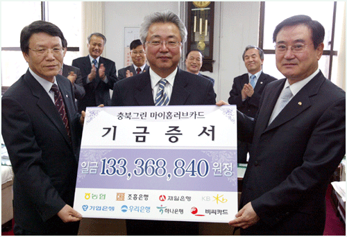 이 기금은 충북도민이 2004년 한해동안 이용한 충북그린마이홈러브카드 이용액중 0.2%를 적립, 전달한 것으로 최근 4년 동안 매해 1억원 이상의 기금이 조성되고 있다.