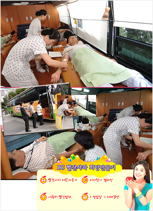 대한적십자사 남부혈액원에서 헌혈버스 2대가 지원 나왔고, 오전 9시부터 오후 5시까지 96명의 비씨가족들이 소중한 사랑을 나누었으며, 대부분의 헌혈자들은 헌혈증을 소지하지 않고 기부함에 넣음으로서 나눔을 실천했다.