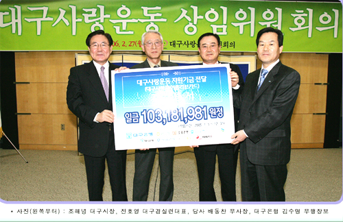 당사는 지난 2월 27일 대구전시컨벤션센터(EXCO)에서 열린 2006년도 제1차 대구사랑운동 상임위원회의에서 "대구사랑 마이홈러브카드"로 조성된 103,181,981원의 기금을 대구사랑운동시민회의에 전달하였다.