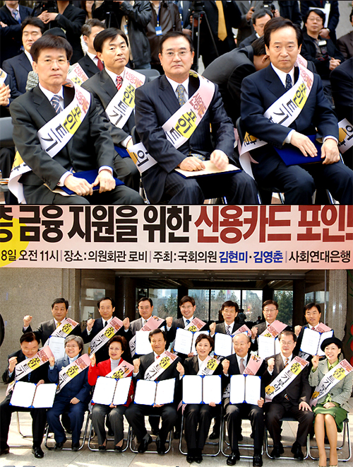 3월 8일(수) 오전 11시부터 오후 6시까지 여의도 국회의원회관 1층 로비에서 열린우리당 김현미, 김영춘의원의 공동 제안으로 "저소득층 금융지원을 위한 신용카드 포인트 기부의 날"행사가 열렸다. 국내 마이크로 크레딧 단체등이 참가한 가운데 열린 이날 행사는 신용카드 포인트중 일부를 자활의지가 높은 저소득 계층의 창업이나 취업등을 지원하기 위한 재원으로 조성하기 위한 목적으로 열렸다. 이날 행사에는 김현미의원, 국회정무위원장 김희선의원, 국회사무총장 남궁석의원등이 참석하였으며 업계에서는 당사 배동찬부사장을 비롯, 신한카드 홍성균사장 등 삼성, 현대, 롯데카드 등에서 관련 임원등이 참석했다. 배동찬부사장은 이날 본인에게 적립된 TOP포인트를 마이크로 크레딧 단체에 기부하는 서약서를 전달했다. |