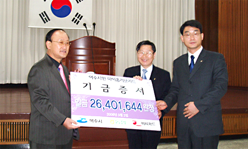 순천지점 정명철 지점장은 3월 2일(목), 여수시청에서 김충수 농협 여수시 지부장과 함께 '여수시민 마이홈 러브카드'에 의해 적립된 기금 2천 6백만원을 김충석 여수시장에게 전달했다. 여수시와 순천지점, 농협 여수시지부 관계자들은 여수시 월례조회에서 전달된 이번 기금 전달식에 앞서 상호 적극적인 협조를 통해 여수시민카드의 지속적인 확산을 위해 노력키로 했다.