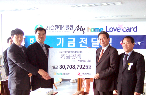 당사(창원지점)는 지난 3월 8일 진해시청 시장실에서 2005년도 "21C 진해시발전 마이홈러브카드"로 조성된 30,708,792원의 기금을 진해시에 전달하였다.