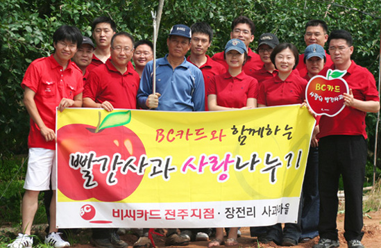 또한, 당점의 애사심 고취와 연말 불우이웃돕기 행사를 위하여 '비씨카드 사랑의 빨간사과'를 위한 사과나무 일곱그루에 푯말을 부착하고 올가을에풍성한 수확을 기원했다. 무더위에 처음으로 하는 농촌일손돕기에 어려움이 많았으나 일손이 많이 필요한 수확시기에 다시 방문할 것을 약속하면서 기쁜마음으로 행사를 마쳤다. |