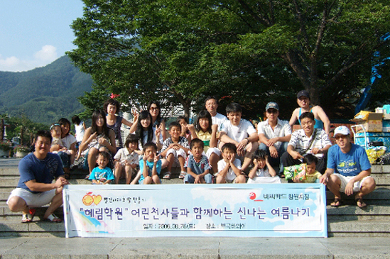 8월 26일(토), 창원지점은 자매결연을 맺고 있는 경남 의령군 사회복지재단 혜림학원 어린이들과 신나는 여름나기 1일 봉사활동을 진행했다. 혜림학원은 1957년에 설립된 아동보육시설로 1세부터 고등학생까지 부모가 없는 원생들의 삶의 터전이다. 창원지점은 2005년 11월 24일 자매결연을 맺은 이후 매 분기마다 원생들에게 꿈과 희망을 나눠 주는 행사와 후원을 하고 있다. 행사당일 우천의 염려는 말끔히 사라지고 한낮 기온이 30도를 넘는 마지막 여름의 끝자락을 시원한 부곡하와이(경남 창녕군) 야외풀에서 다양한 이벤트 행사로 진행했다. 창원지점 13명의 지점 식구들과 혜림학원 유치부/초등부 원생 및 인솔교사 14명이 참가한 가운데 다채로운 레크레이션 활동으로 평소 놀이공원을 동경하던 천사들에게 꿈과 희망을 줄 수 있었던 시간을 마련하였으며, 지점식구들이 직접 준비한 간식등으로 무더운 여름 한낮의 더위를 피해 마음껏 먹고 즐기는 시간을 가졌다. |