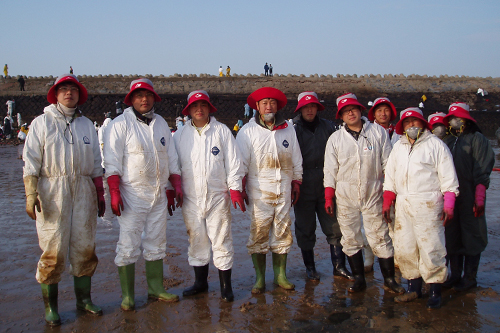 마스크를 착용하고 장화와 고무장갑으로 무장한 채 악취와 기름으로 뒤엉킨 해안 및 선착장에서 미리 준비한 헌 옷가지 등을 이용해 모래에 섞여 있는