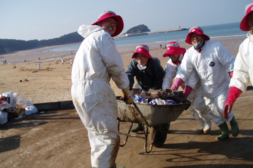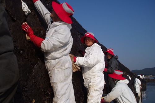타르 덩어리 제거와 바위, 자갈 등에 붙어 있는 기름을 닦아 냈다. 특히, 빨간사과봉사단은 접근이 곤란한 선착장 벽에 붙어 있는 기름을 썰물 때를 맞춰
