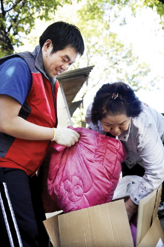 세상에서 가장 따뜻한 마음, 사랑을 전달합니다! 찬바람에 입김이 날 정도로 추웠던 날. 비씨카드 빨간사과봉사단은 능인종합사회복지관과 함께 강남구 개포2동에 위치한 무허가 판자촌 달터마을을 찾았다.1980년대 형성된 달터마을은 빈민촌,노인, 장애인, 한부모가정, 소년소녀가정 등 260여 세대가 살아가고 있다. 무허가로 지어진 낡은 집과 공동화장실, 마을 내 폐품 수거장과 같은 비위생적인 시설 등 다른 사람들보다 힘겨운 삶을 살아가고 있는 이곳 사람들은 매년 찾아오는 겨울이 그리 반갑지만은 않다. 이런 달터마을에 올해 겨울엔 산타클로스의 선물이 미리 도착했다. 비씨카드 빨간사과봉사단과 능인종합사회복지관은 달터마을 사람들에게 김장김치와 이불을 지원하고, 다섯가구의 도배와 장판 교체 등 월동지원사업을 펼쳤다.아침 9시30분. 능인종합사회복지관에 먼저 모인 13명의 빨간사과봉사단은 사회복지사로부터 오늘 봉사활동에 대한 사전지식과 자원봉사자교육을 받은 뒤 달터마을로 향했다. 나눔의 의미를 실천하러 온 때문일까. 봉사단들의 얼굴엔 추위도 녹여버릴미소가 한가득이다. 달터마을 입구에서 김치 나르기로 시작된 봉사활동. 리어카에 지원물품을 싣고 앞에서 끌고 뒤에서 밀고, 한사람이 한개씩 지원물품을 옮겼는데 어느새 봉사단들 서로가 징검다리를 만들고 있었다. 중간중간 누군가 내뱉은 '얼쑤!'하는 추임새는 서로의 웃음을 유발했고 그 웃음은 봉사활동을 전혀 힘들지 않게 만들었다. 여성분들은 조금 천천히 해도 된다는 남직원의 말에 봉사에 남녀가 어딨냐며 젖 먹던 힘까지 내는 여사우들. 환경정비사업의 일환으로 진행된 도배, 장판 공사에서는 추운날씨에도 아랑곳 없이 땀을 뻘뻘 흘리며 일하던 수습사원, 비씨카드 빨간사과봉사단의 붉은 조끼가 봉사에 대한 이들의 붉은 마음, 열정을 상징하는 듯 했다. 나눔, 자신이 더 행복해 지는 마법 "따뜻한 겨울 나세요." 겨울 내내 달터마을 사람들의밥상을 책임질 김장 김치와 사람의 체온처럼 따뜻한 이불을 전달하며 봉사단들은 따뜻한 말 한마디로 잊지 않는다. 점심식사 후 본격적으로 시작된 도배와 장판 교체 작업. 봉사단들은 일반 사람들이 하기 힘든 이 작업을 그 자리에서 도배 전문가들에게 하나하나 배워 '하는 척'이 아닌 '직접' 모든 작업을 해냈다. 어른 키만한 낮은 천장에 원래 있던 낡고 오래된 벽지를 뜯어내고 울지 않게 꼼꼼히 벽지를 발랐다. 또한 장롱 같은 무거운 물건에서 작은 세간살이 하나까지 직접 여기저기 옮겨가며 장판을 깔았다. 봉사단 모두 우리 집이라는 생각으로 정성을 다했다. 그리고 모자란 솜씨지만 마무리 청소까지 봉사단들의 마음은 전문가 못지 않았다. 다른 곳에서였다면 힘들다고 조금 꾀를 부릴만도 한데 모두들 앞장서 열심히 하는 걸 보니 '봉사는 힘든 일도 힘들지 않게 여겨지게 하고,누군가를 위해 시작했지만 하고 나면 자신이 더 행복해 지는 마법'이라는 말을 새삼 느끼게 된다. 비씨카드 빨간사과봉사단이 다녀간 달터마을엔 그냥 동그란 달이 아닌 하트모양의 사랑의 달이 올 겨울 내내 따뜻하게 빛나고 있을 것이다. |