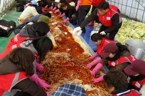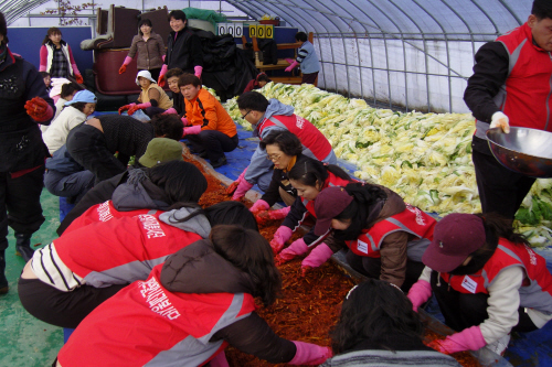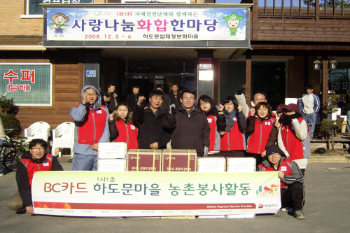 강릉지점 속초하도마을 김장 1500포기 대작전 강릉지점이 당사와 자매결연 마을인 속초 하도문 마을과 함께 사랑의 김장 행사를 진행하였다.하도문 마을에서는 배추와 고추가루 등 젓갈을 제외한 모든 재료들은 직접 재배하고 정제한 것들로 준비 하였고 강릉지점에서는 일사분란하게 단한명의 열외없는 모든 직원들이 참석을 하여 봉사활동을 하였다.하도문으로 가던날 하늘에서도 강릉지점의 선행을 축복하듯이 올해 들어 가장 추운 날씨를 선물하였지만 강릉지점 식구들은 봉사활동에 대한 뜨거운 열정으로 영하 10도가 넘는 강추위속에서 1,500포기를 김장김치로 변모시켰다. 처음에는 엄두도 나지 않던 많은 양으로만 보이던 1,500포기의 배추가 한포기 한포기 김치로 변모 되어 포장지에 담길때 힘들어 하던 강릉지점 식구들은 미소를 짓게 되었고 이 날 만든 김치는 속초지역 사랑의 밥집, 보호관찰소 및 독거노인 분들께 전달되어 겨울내 반찬걱정을 하시지 않도록 도와드렸다. 속초지역에도 형식적으로 1사1촌만을 맺은 마을이 많지만 BC카드와 하도문 마을처럼 지속적으로 봉사활동을 같이 하는 곳이 없다며 자랑스럽게 이야기 하는 이장님과 별거 아닌 것 같은 김치를 받으면서 너무 고마워 하시던 사랑의 밥집 신부님을 보면서 강릉지점 식구들은 그날의 힘겨움을 모두 잊을 수 있었다. 내년에는 더 많은 김치로 더 많은 사람들에게 더욱 큰 행복을 주었으면 하는 강릉지점 '빨간사과 봉사단'의 선행은 내년뿐 아니라 내후년까지 지속적으로 계속 될 것이다. |