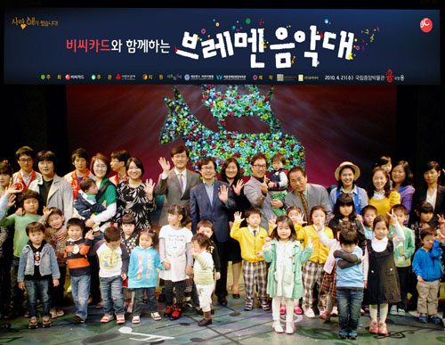 비씨카드와 함께하는 브레멘 음악대 문화공연 초청 행사 비씨카드는 2010년 4월 21일 오후 4시 국립중앙박물관 극장 ‘용’에서 공연되고 있는 어린이 뮤지컬 ‘브레멘 음악대’에 문화소외계층 800명을 무료로 초청하는 행사를 가졌다. 지난 해에 이어 2회째 이 행사를 후원하고 있는 비씨카드는 문화공연 관람이 어려운 어린이들에게 문화공연 체험의 기회를 제공, 한 걸음 더 나아가 어린이들에게 희망과 용기의 메시지를 주기 위해 서울사회복지공동모금회를 통하여 이 행사를 후원하고 있다. 이 날 진행된 행사에는 강북, 관악, 마포, 중랑구에 위치한 영유아통합지원센터의 저소득층아동, 서울장애인종합복지관의 장애아동, 신촌 세브란스 어린이병원의 환아 및 가족 800여명이 참석한 가운데 성황리에 진행되었다. ‘브레멘 음악대’는 2006년 초연 이후 17만 관객을 돌파하고 뮤지컬의 배경이 되는 브레멘에 역 수출된 명품 가족 뮤지컬로, 어린이들에게 친숙한 네 마리 동물들이 꿈을 찾아 브레멘까지 가는 동안 겪는 에피소드를 바탕으로 꿈을 이루어 간다는 내용으로 어린이들에게 ‘넌 할 수 있어!’라는 메시지를 전달하고 있다. 특히, 이 날 행사는 봉사와 나눔의 정신을 실천한다는 취지에 따라 행사의 기획 및 진행을 30여명의 비씨카드 ‘사랑,해 봉사단’단원들 및 기타 봉사단체 자원봉사자들의 수고로 행사가 진행되었다. 한편, 비씨카드는 2005년부터 빨간밥차 지원, 다문화가족지원 등 다양한 사회공헌활동을 진행해 오고 있고, 2006년부터는 ‘사랑의 바이올린’ 음악회 행사를 매년 지원하는 등 기업의 메세나 활동도 지속적으로 전개하고 있다. |