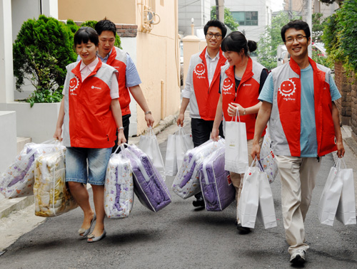 비씨카드와 함께하는 용산구 쪽방촌 생필품 나눔 봉사활동 용산구 쪽방촌에도 사랑,해가 떴습니다! 무더운 여름이 우리에게 일찍 다가왔던 지난 16일(수). 비씨카드 사랑,해 봉사단은 용산구 쪽방촌을 방문했습니다. 경제적으로 어려운 무의탁 어르신 250가구에 여름 나기 생필품을 전달하는 봉사활동을 실시하였습니다. 이날 행사는 재래시장 활성화를 위하여 당사에서 구입한 재래시장 상품권으로 홑이불, 고추장, 햄 통조림, 즉석요리제품을 구입하였고, 전국 시장에서 사용 가능한 상품권 5만원씩 전달해드리는 활동이었습니다. 쪽방촌에 거주하고 계신 어르신들 중 최고령 어르신(1911년생)과 노부부에게는 모시메리도 함께 드렸습니다. 방문했던 쪽방촌은 낮 시간인데도 불구하고 한줄기 햇빛 조차 들어오지 않은 어두컴컴한 곳이었고, 한 사람이 겨우 다닐 수 있는 통로였으며, 경사는 이루 말할 수 없이 가파랐습니다. 그럼에도 불구하고 우리 사랑,해 봉사단들은 양손에 이불과 생필품들을 한가득씩 들고 다니며 각 가정을 방문하여 전달해 드렸습니다. 가정에 계신 어르신들께서는 1평 남짓한 비좁은 방안에서 물품들을 받아 드시면서 더운데 너무 고생이 많다며 이렇게 도와주셔서 감사하다는 말씀을 전해주셨습니다. 봉사활동을 모두 마치고 사랑,해 봉사단의 옷에는 땀으로 얼룩 졌지만 그 마음만큼은 사랑과 보람으로 새겨졌을 것입니다. |