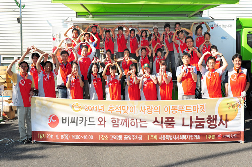 2011년 추석맞이 사랑,해 식품나눔행사 비씨카드는 2009년부터 매년 서울시 사회복지협의회와 함께 식품 나눔행사를 진행하고 있습니다. 이번 “사랑,해 이동식 푸드마켓 식품나눔 행사”는 2011년 추석을 맞아 상품 진열을 위해 별도로 5통 차량을 특별 개조한 차량내부에서 생필품을 진열한 후 이용객들의 거주지로 직접 순회방문을 하여 약 35명의 사랑,해 봉사단들이 생필품을 전달하고 미용봉사활동을 펼쳤습니다. |