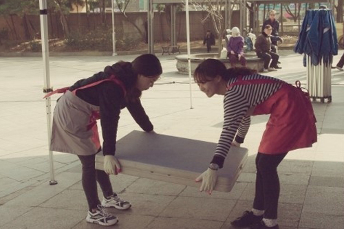 오늘도 어김없이 9시에 짠~하고 나타난 빨간밥차. 천막을 치고 테이블까지! 완벽 세팅. 갑자기 활동을 취소한 봉사팀 때문에 오늘은 저희가 직접 식사 준비에 나섰는데요. 역시 빨간밥차 봉사단은 빨간밥차에서는 없어서는 안될 존재입니다. 오늘 정말 큰 몫을 해낸 빨간밥차 봉사단! 앞으로 봉사단의 역할이 더 중요해 질 것 같습니다.