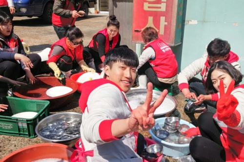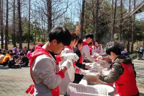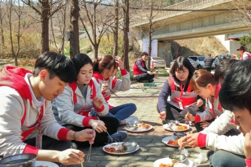테이블과 의자가 아닌, 돗자리 위에서 식사를 드시는 어르신들을 위해 빨간밥차에 도착하자마자 자리 세팅을 합니다. 재료를 다금고 맛있는 요리가 완성되는 동안 봉사단원들과 마시는 커피 한잔은 꿀맛입니다.