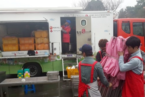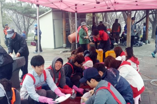 비 내리는 날씨, 밥차 봉사를 나가기 전부터 걱정을 했습니다. 남자 봉사 단원들이 모여 힘을 쓰는 동안 여자 봉사단원들은 열심히 음식 재료를 다듬었습니다. 야외에서 하는 식사를 위해 주변 청소도 깨끗이 해야겠죠? 설거지는 남녀를 가리지 않습니다. 모두 두 손 걷어 부치고, 설거지!! 오늘도 무사히 빨간밥차 봉사활동을 마쳤습니다.