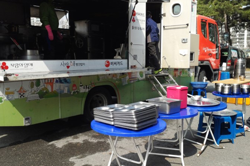 드디어 세번째 봉사는 야외에서 합니다. 야외에서 본 밥차는 더 크고 멋있어 보였습니다. 봉사 전 커피 한 잔! 으쌰 으쌰 힘이 납니다. 테이블도 준비하고 배식 준비를 마치면 어르신께 대접할 식사를 한 분, 한 분씩 가져다 드립니다. 오늘의 메뉴, 북어국! 든든하게 한 끼 맛있게 먹었습니다.