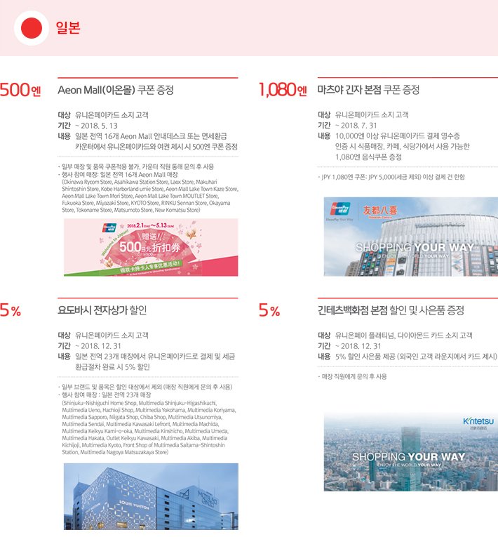 • 내용 : 일본 전역 23개 매장에서 유니온페이카드로 결제 및 세금 환급절차 완료 시 5% 할인